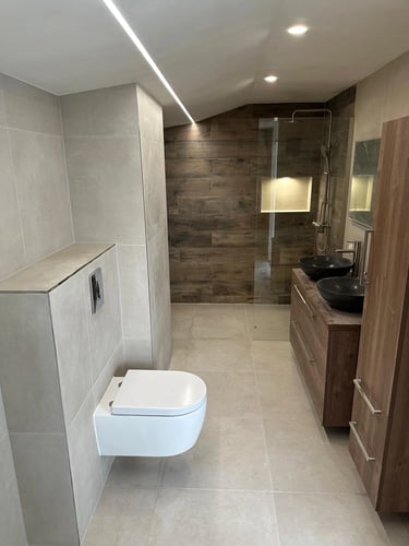 Moderne badkamer met strak tegelwerk, inloopdouche en hoogwaardige afwerking.