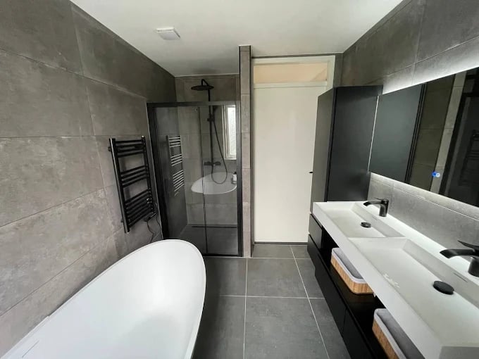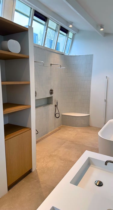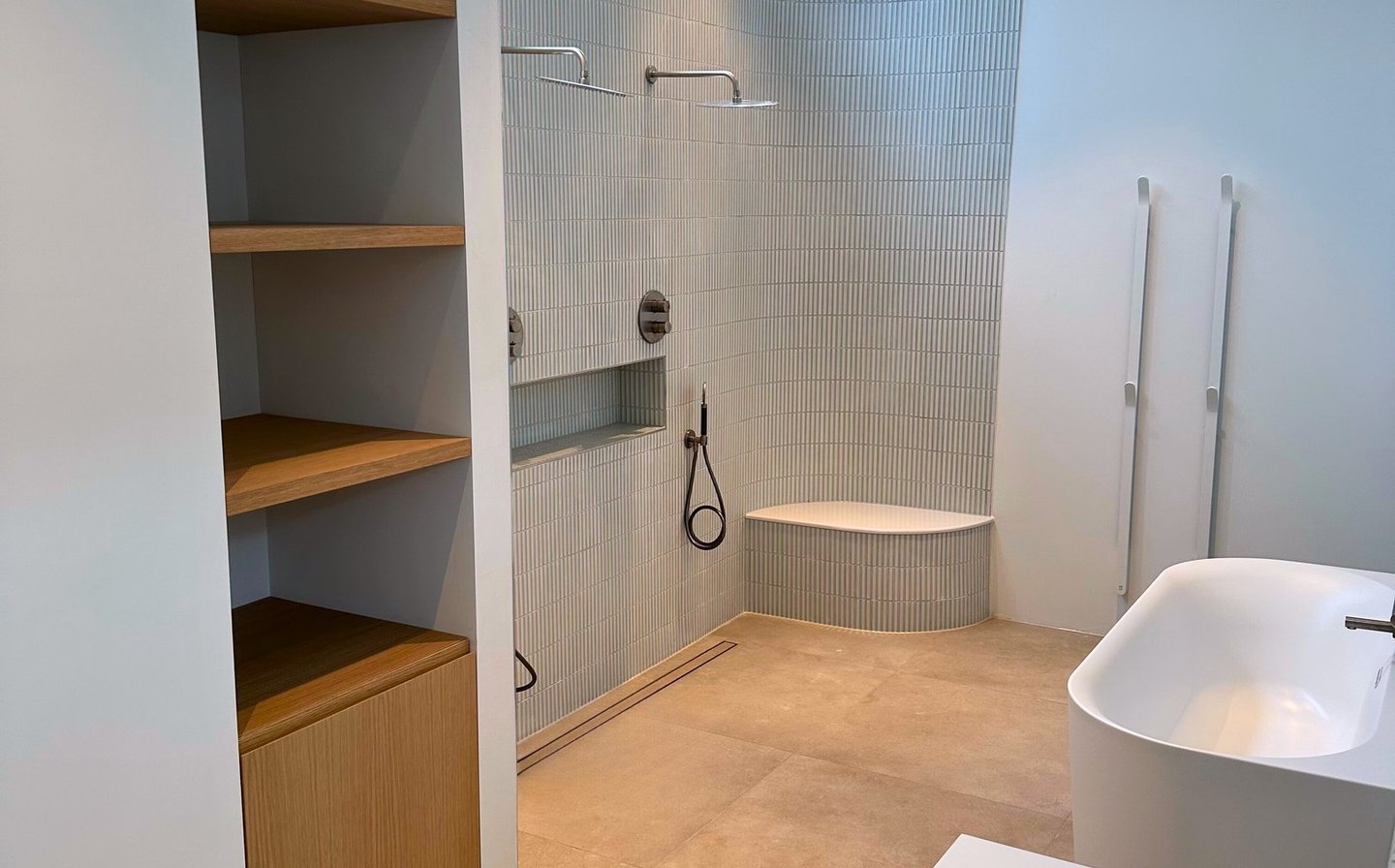 Moderne badkamer met strak tegelwerk, inloopdouche en hoogwaardige afwerking.